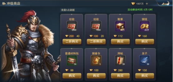 建立角色前7日,每日均会开放一个冲级商店,在商店中除了能买到铜钱粮草等游戏资源外,还可以超低价值购买2份经验值。
