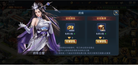 玩家可在府库中征收银两及铜钱,每收复一个城池,即可获得一次免费征收的机会。