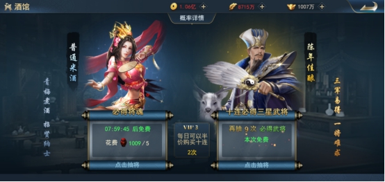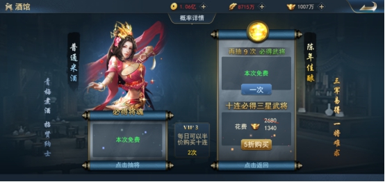 玩家在酒馆中可招募武将,酒馆招募分为米酒宴请与陈酿宴请。米酒宴请需消耗女儿红,有可招募到低中资质的武将。
