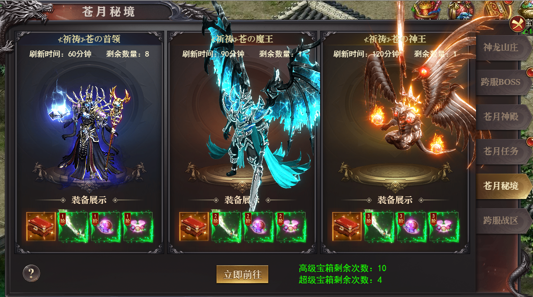 1、苍月岛增加秘境BOSS地图,刷新:苍月首领、苍月魔王、苍月神王