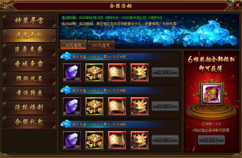 活动说明:活动期间,满足相应充值条件即可领取豪华大礼,6档奖励全部领完还可额外获得大礼。