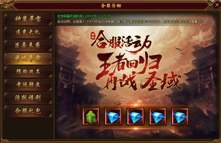 活动说明:合服第3天和第6天开启圣域争霸,每次胜出的帮主可额外获得20000钻石及专属装备屠龙圣印。