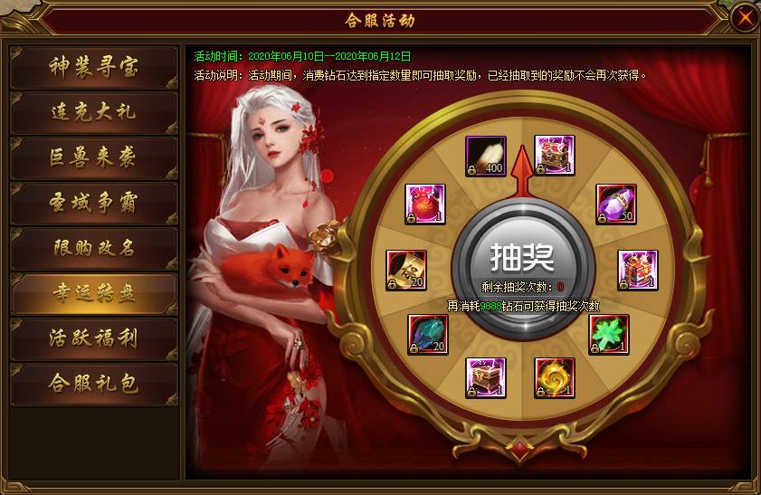 活动说明:活动期间,消费钻石达到指定数量即可抽取奖励,已经抽到的奖励不会再次获得。