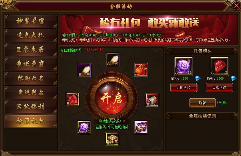 活动说明:活动期间,每购买1个礼包即可获得1次抽取奖励的机会,已经抽到的奖励不会再次获得,每日0点重置抽奖次数。