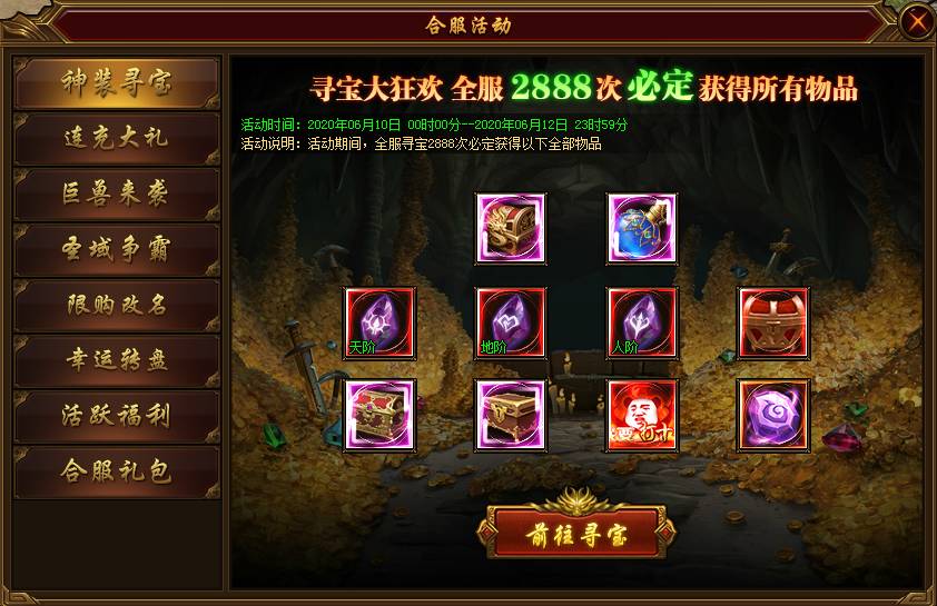 活动说明:活动期间,全服开启2888次寻宝奖池,全服寻宝前2888次必定获得转生兵甲自选箱、转生首饰自选箱、天阶极品符文等珍贵道具。