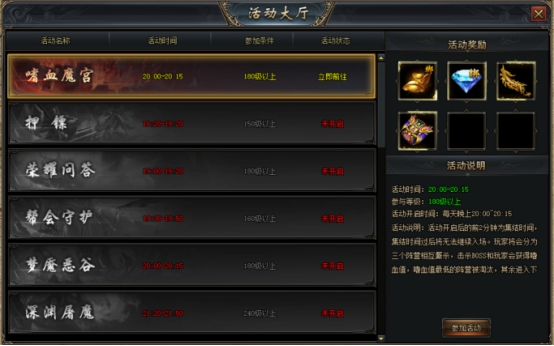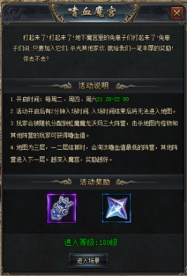 活动开启时间:每天晚上20:00~20:15活动说明:活动开启后的前2分钟为集结时间,集结时间过后将无法继续入场。玩家将会分为三个阵营相互厮杀,击杀BOSS和玩家会获得嗜血值,嗜血值最低的阵营被淘汰,其余进入下一层。越深入魔宫,奖励越好。