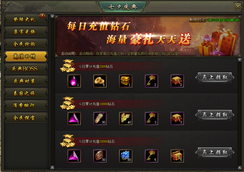 活动说明:活动期间,每日充值达到指定额度,即可领取超值豪礼,每种档位可领取1次