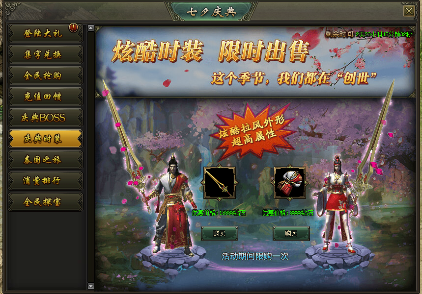 活动说明:活动期间,绝版时装限时出售,炫酷拉风外型、超高属性都在这里!