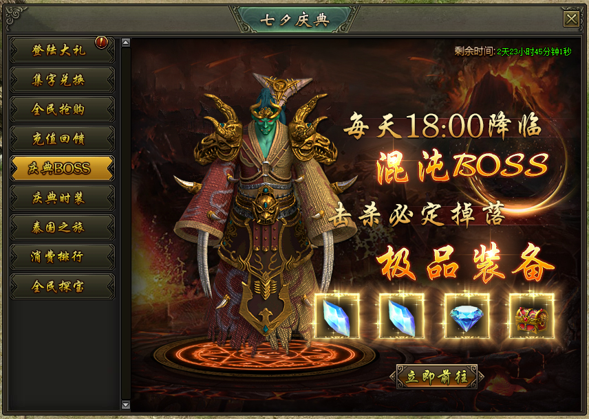 活动说明:活动期间,每天18:00混沌魔殿入口限时开启,全服玩家合力击败2大混沌BOSS,有机会获得海量元宝、钻石、稀有材料及高级装备奖励