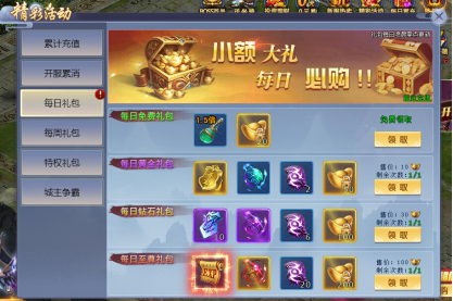 开服期间每日可领取和购买超值日礼包,持续7天