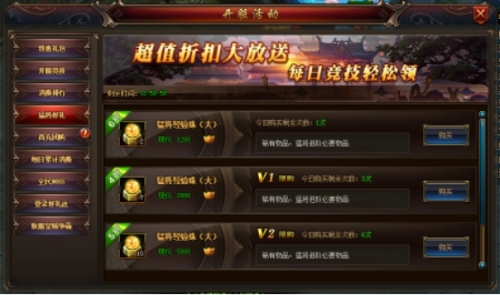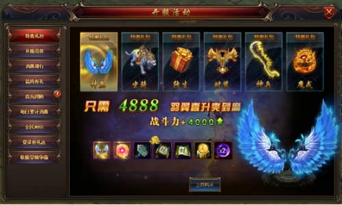 活动期间内玩家可花费少量钻石购买丰厚礼包,礼包可快速提升猛将等级、翅膀阶数,更有海量元宝任性使用。