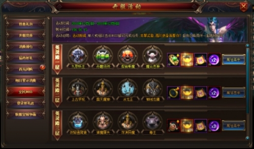 英灵殿二层 | 上古祭祀、震天魔神、冰龙王、神域龙鹰 | 炎龙戒指*1、100元宝、转生卷轴*1、双倍经验丹*1 |