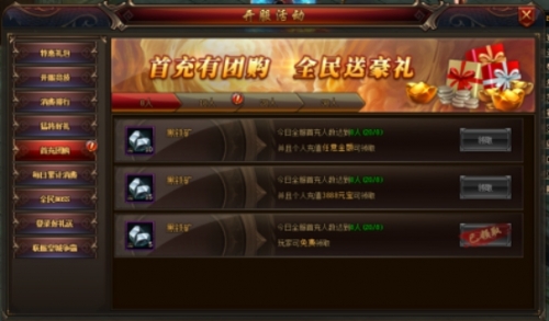 活动期间内全服首充玩家每达到一定人数即可获得超值奖品,人人有份,立刻行动吧!