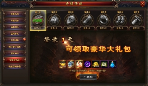 活动期间,玩家登陆达到指定天数就可以领取豪华大礼包,累计登陆的天数越多,获得的奖励越丰富!