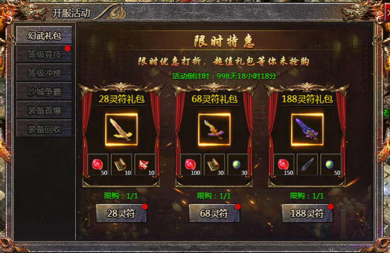 一. 幻武礼包1. 活动时间:开服第1天-开服999天 2. 活动说明: 活动期间可购买超值幻武礼包,好看又强大,你值得拥有!
