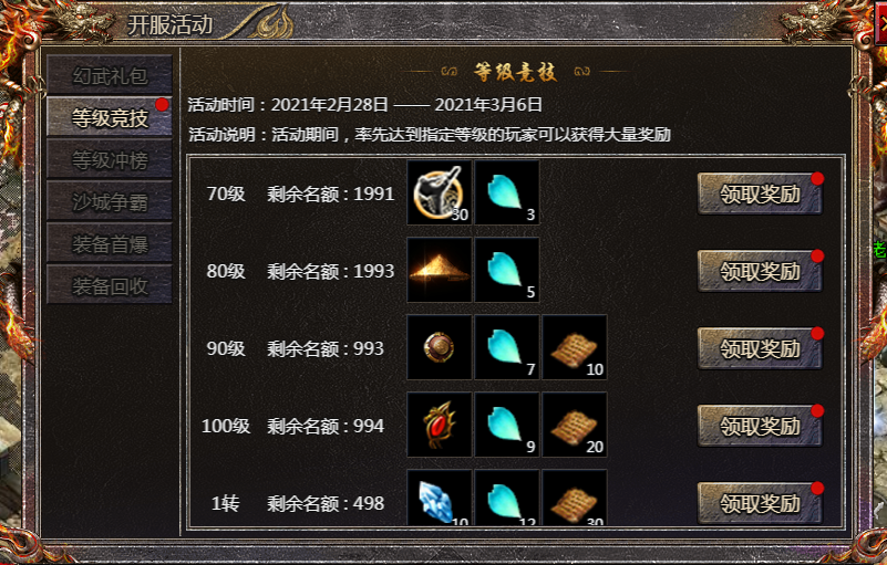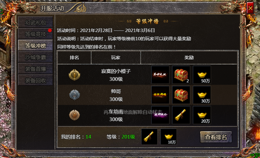 三. 等级冲榜1. 活动时间:开服第1天-开服7天 2. 活动说明: 活动持续7天,玩家需要提升等级来获得一个高排名,获得结束后,玩家等级榜前10的玩家可以获得大量稀有奖励,同等级按优先达到者排名靠前。