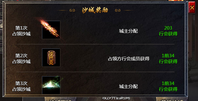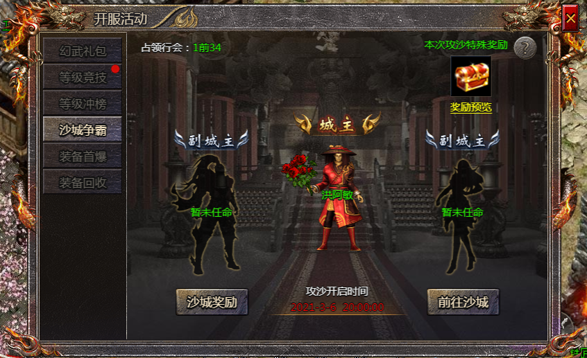 四. 沙城争霸1. 活动时间:开服第1天-开服30天 2. 活动说明: 活动期间举办的开服沙城争霸,本次占领皇宫的帮会帮主及七成员将会获得一份特殊的奖励。