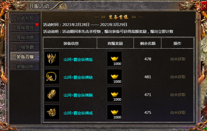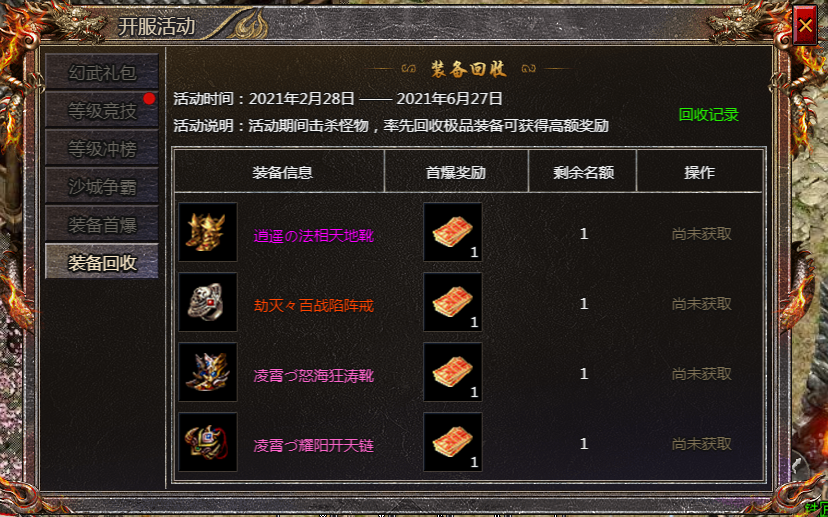 五. 装备首爆1. 活动时间:开服第1天-开服30天 2. 活动说明: 活动期间率先击杀怪物,爆出装备可获得高额奖励,爆出立即可领取,名额有限,先到先得。 六. 装备回收1. 活动时间:开服第1天-开服120天 2. 活动说明: 活动期间击杀怪物,爆出装备指定装备可回收成灵符,名额有限,先到先得!