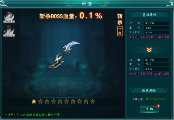 当切割达到3阶,会自动激活斩杀功能。 斩杀同样分为十阶,没阶十颗星。可消耗元宝进行升阶,每次升阶可提升斩杀伤害百分比上限。 斩杀还可通使用道具解锁两个技能,超级斩杀和斩杀概率。其中超级斩杀可增加5%的斩杀伤害。斩杀概率则使斩杀概率触发增加一倍。 |