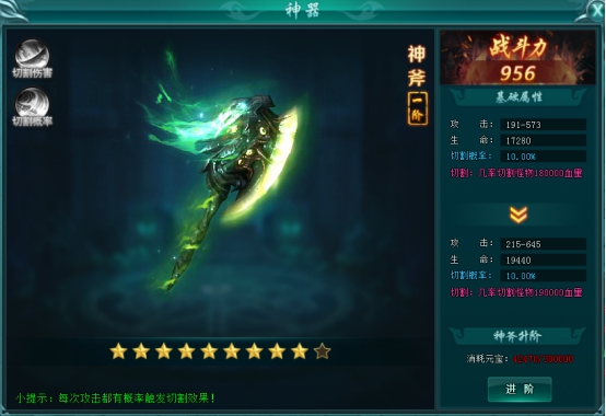 当前神器分为两类,切割和斩杀。 当玩家达到315级,神斧即可激活,激活神斧可获得切割效果。神斧共分为十阶,每阶十颗星。可消耗元宝进行升阶,每次升阶提升大量切割伤害。 神斧还可通使用道具解锁两个技能,切割伤害和切割概率。其中切割伤害可增加100万切割伤害。切割概率则使切割概率触发增加一倍。