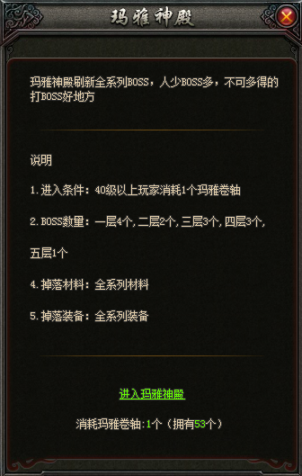 每次进入都将消耗1个玛雅卷轴 玛雅神殿一共5层,每层都有大量BOSS,击杀后可获得极品装备,是玩家行会争夺资源的首选(玛雅卷轴可在商城购买)