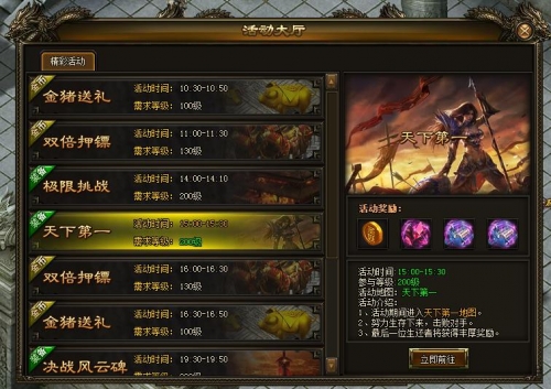 天下第一开启时间:15:00-15:30,活动开启5分钟后不能再进入