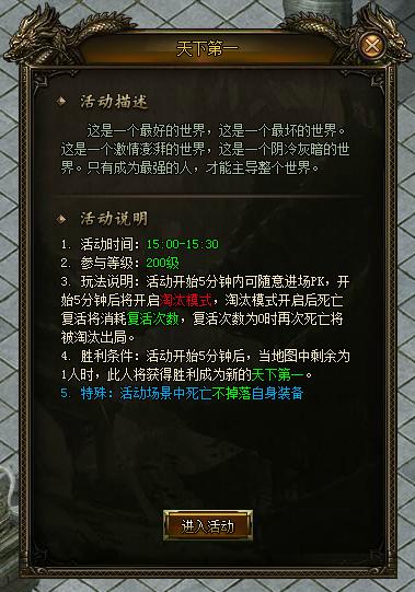 非常残酷的淘汰模式,只有最强的玩家才能生存下来,成为天下第一。 特别注意:活动场景内死亡不掉落装备 |