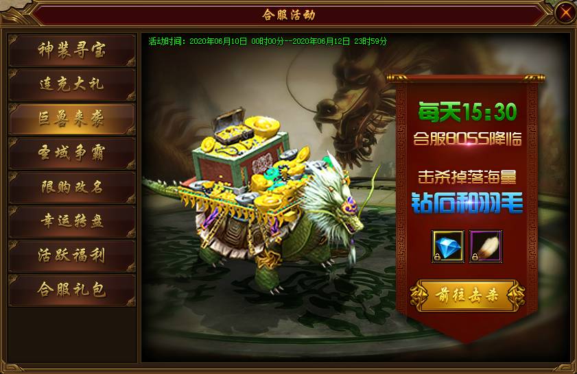 活动五:巨兽来袭 活动说明:活动期间,每天15:30合服BOSS携带海量钻石、羽毛降临。