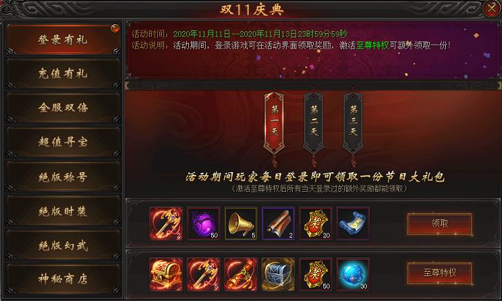 战龙双11庆典节日活动 活动时间:11月11日00:00:00-11月13日23:59:59 活动一:登录有礼 活动时间:11月11日00:00:00 -11月13日23:59:59 活动说明:活动期间,每日登录游戏可领取奖励,激活至尊特权可额外领取一份!