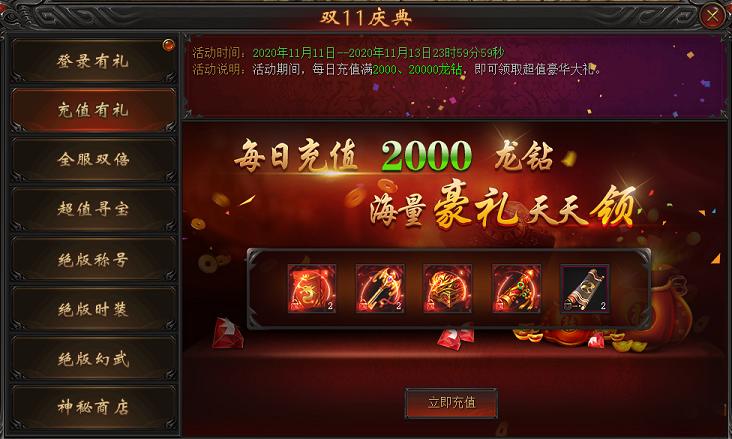 活动二:充值有礼 活动时间:11月11日00:00:00 -11月13日23:59:59 活动说明:活动期间,每日充值满2000、20000龙钻!还能领取超值豪华大礼