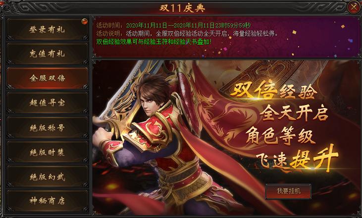 活动三:全服双倍 活动时间:11月11日00:00:00 -11月13日23:59:59 活动说明:活动期间,全服双倍经验活动全天开启,海量经验轻松得。双倍经验效果可与经验玉符和经验天书叠加!