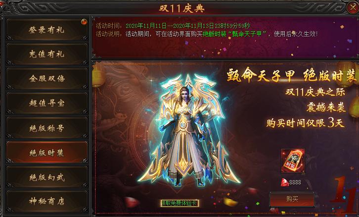 活动六:绝版时装 活动时间:11月11日00:00:00 -11月13日23:59:59 活动说明 : 活动期间,可在活动界面购买绝版时装“甄命天子甲”,使用后永久生效。