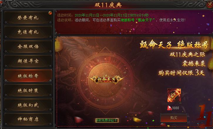 活动五:绝版称号 活动时间:11月11日00:00:00 -11月13日23:59:59 活动说明 : 活动期间,可在活动界面购买绝版称号“甄命天子”,使用后永久生效。