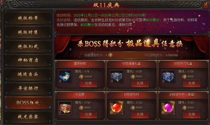 活动十一:BOSS狂欢 活动时间:11月11日00:00:00 -11月13日23:59:59 活动说明 : 活动期间内,击杀BOSS获得“boss积分”,“boss积分”可用于兑换材料,每种材料均有兑换次数限制,“boss积分”在活动结束后,清除归零