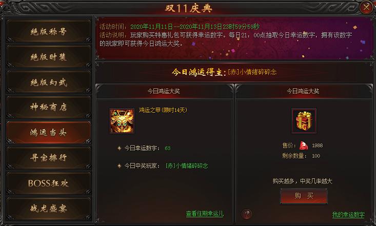 活动九:鸿运当头 活动时间:11月11日00:00:00 -11月13日23:59:59 活动说明 : 玩家每消耗1988龙钻即可获得一个1-100之间的幸运数字。每日21点抽取今日幸运数字,拥有该数字的玩家即可获得今日鸿运大奖。