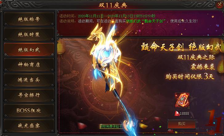活动七:绝版幻武 活动时间:11月11日00:00:00 -11月13日23:59:59 活动说明 : 活动期间,可在活动界面购买绝版幻武“甄命天子剑”,使用后永久生效。