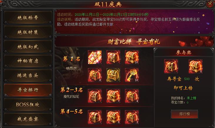 活动十:寻宝排行 活动时间:11月11日00:00:00 -11月13日23:59:59 活动说明:活动期间,战龙秘宝寻宝500次即可获得参与奖,寻宝排名前五升级为超值排名奖励,活动结束后奖励将通过邮件发放。
