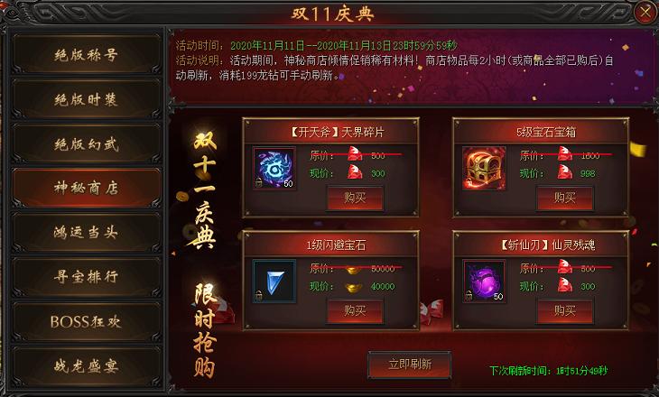 活动八:神秘商店 活动时间:11月11日00:00:00 -11月13日23:59:59 活动说明 : 活动期间,神秘商店倾情促销稀有材料!商店物品每2小时自动刷新(或全商品全部已购后),消耗199龙钻可手动刷新。