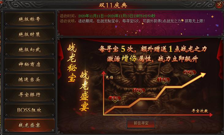活动十二:战龙盛宴 活动时间:11月11日00:00:00 -11月13日23:59:59 活动说明:活动期间,在战龙秘宝中,每寻宝5次,可额外获得1点战龙之力,获取无上限!