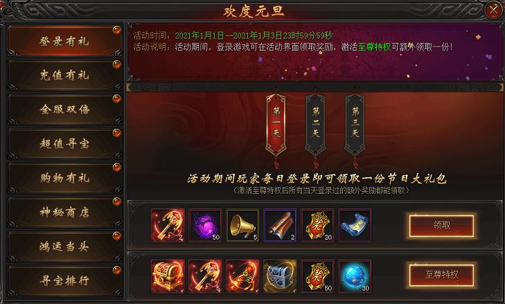 战龙欢度元旦节日活动 活动时间:1月1日00:00:00-1月3日23:59:59 活动一:登录有礼 活动时间:1月1日00:00:00 -1月3日23:59:59 活动说明:活动期间,每日登录游戏可领取奖励,激活至尊特权可额外领取一份! 活动二:充值有礼 活动时间:1月1日00:00:00 -1月3日23:59:59 活动说明:活动期间,每日充值满2000、20000龙钻!还能领取超值豪华大礼