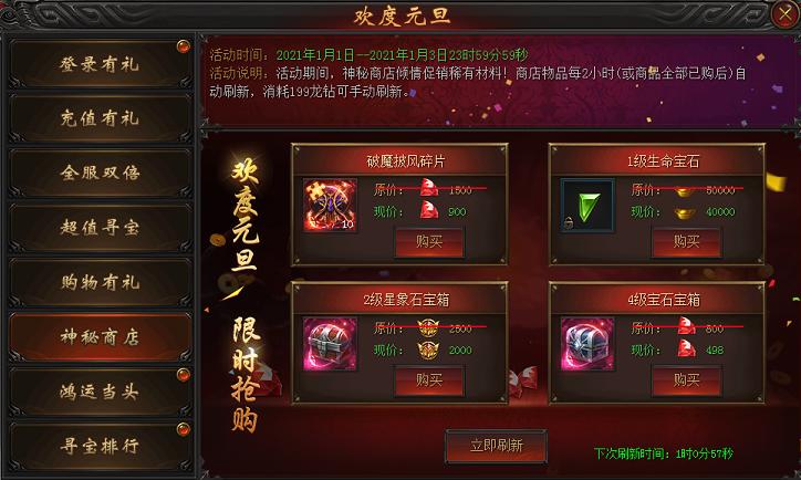活动六:神秘商店 活动时间:1月1日00:00:00 -1月3日23:59:59 活动说明 : 活动期间,神秘商店倾情促销稀有材料!商店物品每2小时自动刷新(或全商品全部已购后),消耗199龙钻可手动刷新。
