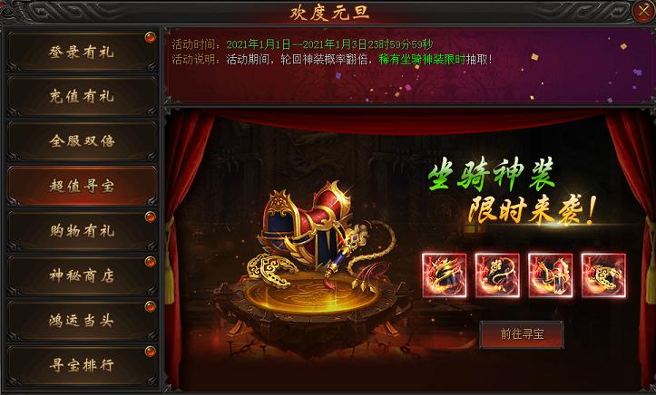 活动四:超值寻宝 活动时间:1月1日00:00:00 -1月3日23:59:59 活动说明:活动期间,轮回神装概率翻倍,坐骑神装限时抽取!