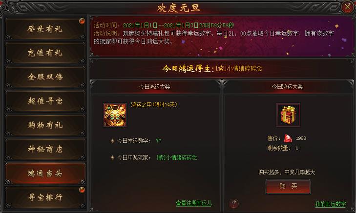 活动七:鸿运当头 活动时间:1月1日00:00:00 -1月3日23:59:59 活动说明 : 玩家每消耗1988龙钻即可获得一个1-100之间的幸运数字。每日21点抽取今日幸运数字,拥有该数字的玩家即可获得今日鸿运大奖。