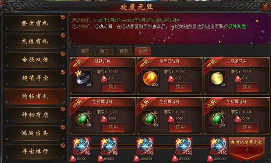 活动五:购物有礼 活动时间:1月1日00:00:00 -1月3日23:59:59 活动说明:活动期间,在活动界面购买特惠商品,消耗龙钻数量达到进度可获得额外奖励!