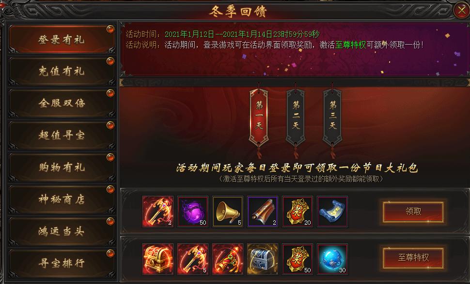 活动时间:1月12日00:00:00-1月14日23:59:59 活动一:登录有礼 活动时间:1月12日00:00:00 -1月14日23:59:59 活动说明:活动期间,每日登录游戏可领取奖励,激活至尊特权可额外领取一份!
