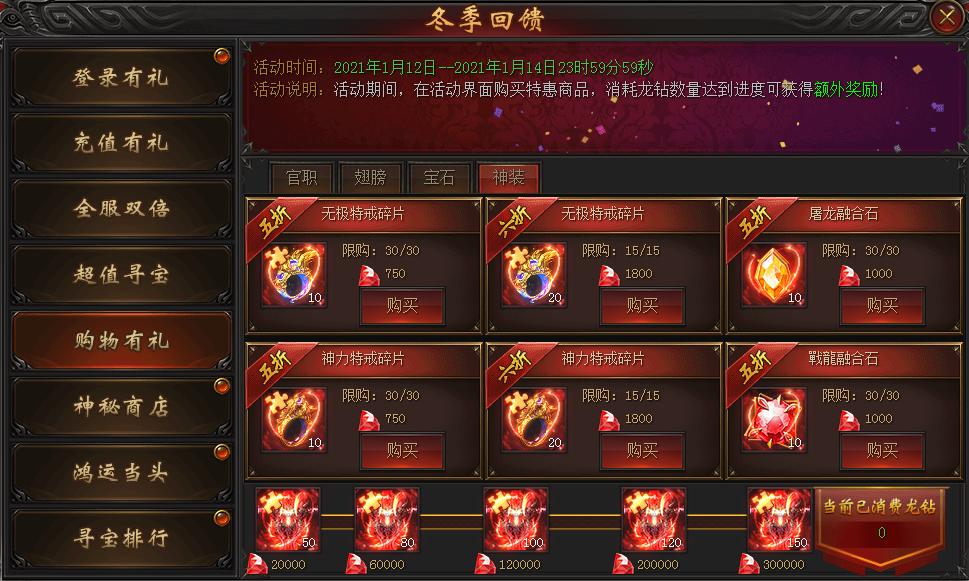 活动五:购物有礼 活动时间:1月12日00:00:00 -1月14日23:59:59 活动说明:活动期间,在活动界面购买特惠商品,消耗龙钻数量达到进度可获得额外奖励!