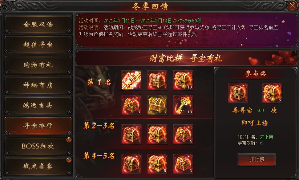 活动八:寻宝排行 活动时间:1月12日00:00:00 -1月14日23:59:59 活动说明:活动期间,战龙秘宝寻宝500次即可获得参与奖,寻宝排名前五升级为超值排名奖励,活动结束后奖励将通过邮件发放。