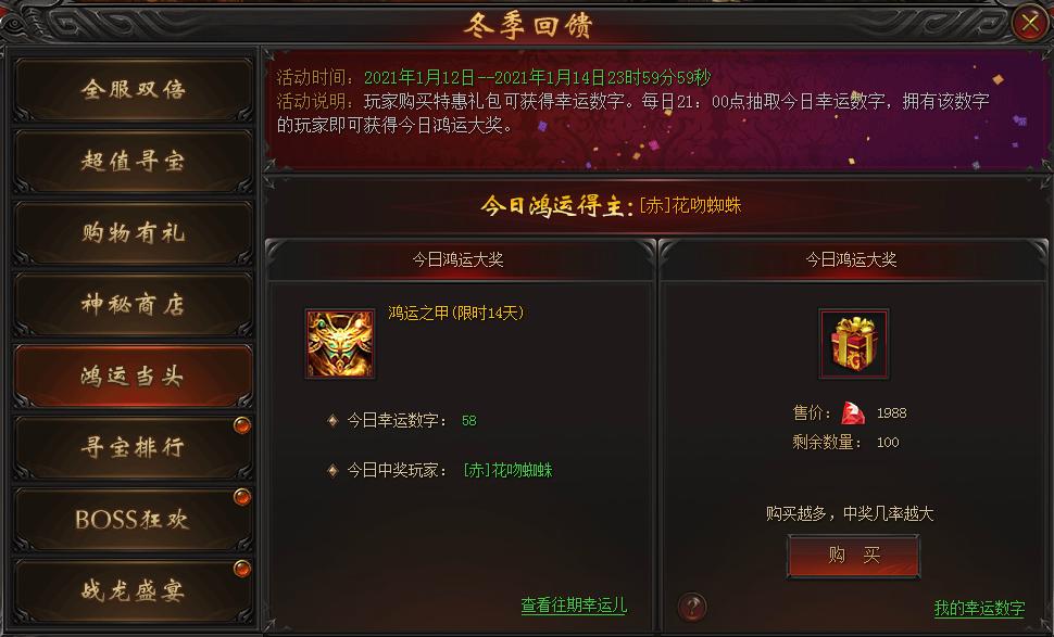 活动七:鸿运当头 活动时间:1月12日00:00:00 -1月14日23:59:59 活动说明 : 玩家每消耗1988龙钻即可获得一个1-100之间的幸运数字。每日21点抽取今日幸运数字,拥有该数字的玩家即可获得今日鸿运大奖。