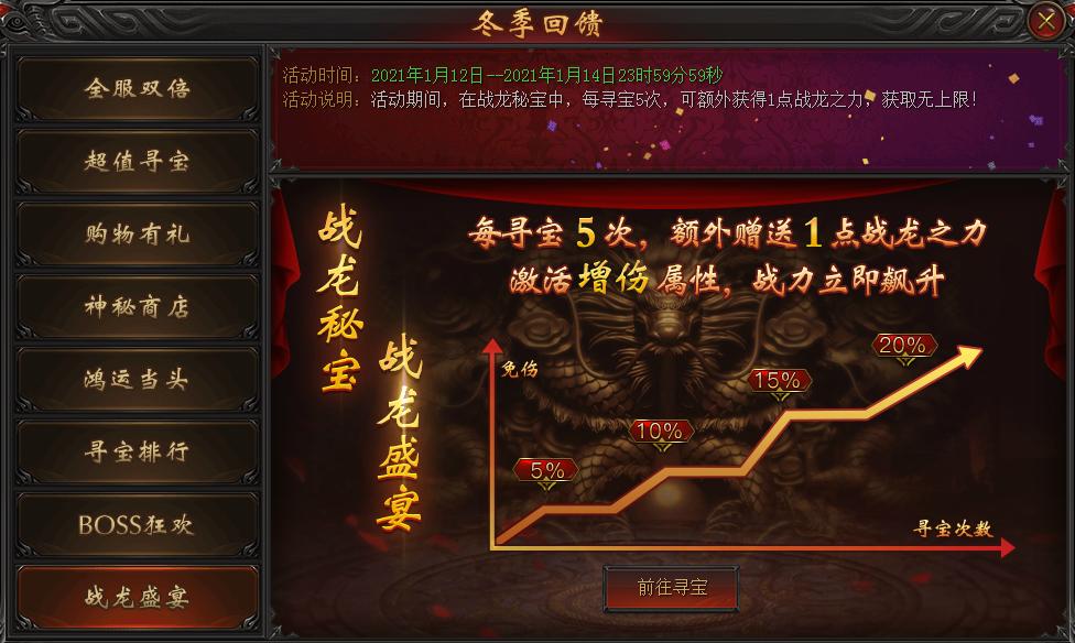 活动十:战龙盛宴 活动时间:1月12日00:00:00 -1月14日23:59:59 活动说明:活动期间,在战龙秘宝中,每寻宝5次,可额外获得1点战龙之力,获取无上限!