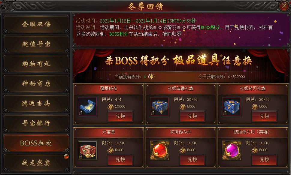 活动九:BOSS狂欢 活动时间:1月12日00:00:00 -1月14日23:59:59 活动说明 : 活动期间内,击杀BOSS获得“boss积分”,“boss积分”可用于兑换材料,每种材料均有兑换次数限制,“boss积分”在活动结束后,清除归零